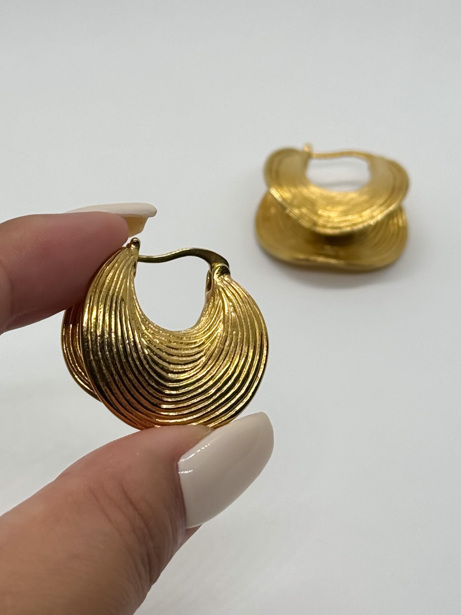 波打つ貝殻のようなデザインが美しい、印象的なフープピアス。